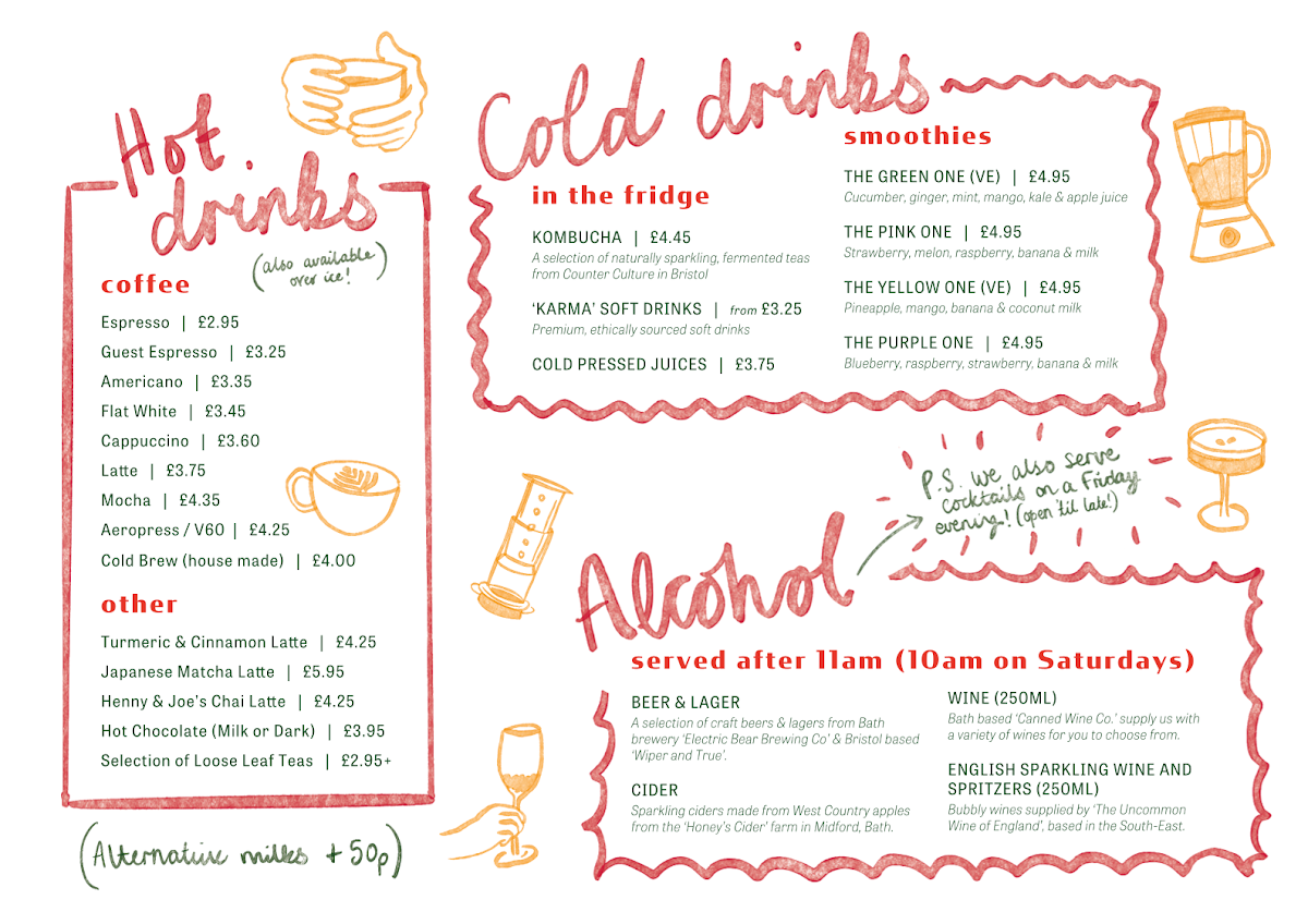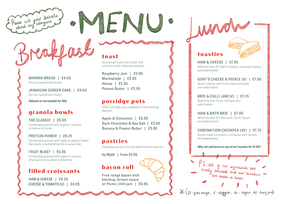 Picnic Coffee, located at 9 Saracen St, Bath BA1 5BR, offers a delightful menu that caters to a wide range of tastes, from hearty breakfasts to refreshing drinks. For breakfast, you can indulge in Banana Bread and Jamaican Ginger Cake, both offering a comforting start to your day. If you're looking for something more energizing, try the THE CLASSICPROTEIN POWER or the refreshing FRUIT BLAST. For a light option, their Sourdough Toast options, such as Sourdough Toast with Jam, Sourdough Toast with Marmalade, or Sourdough Toast with Honey, are simple yet satisfying.