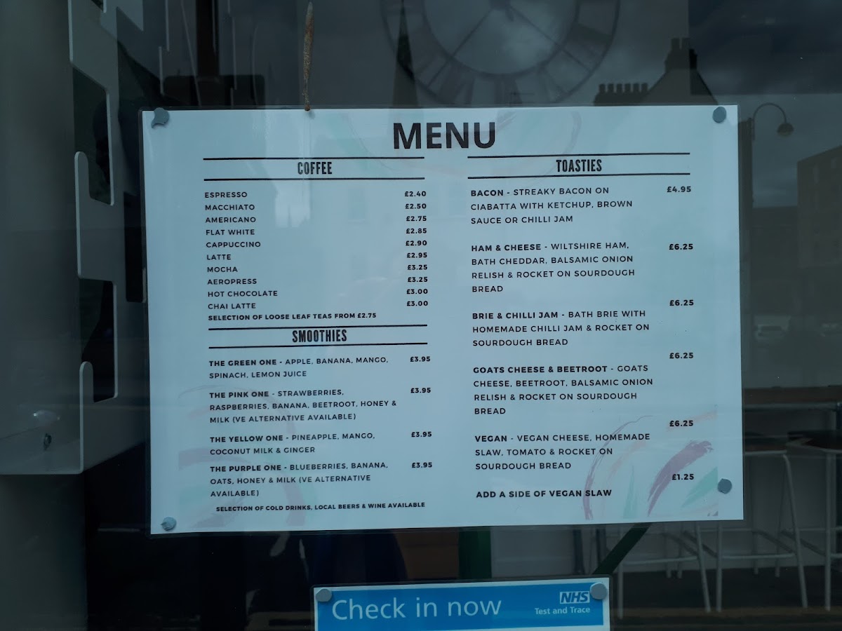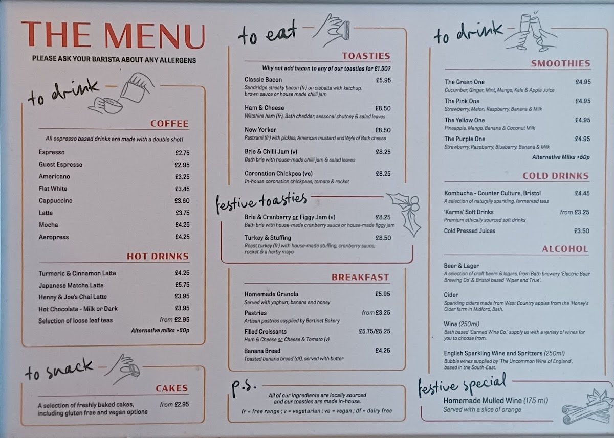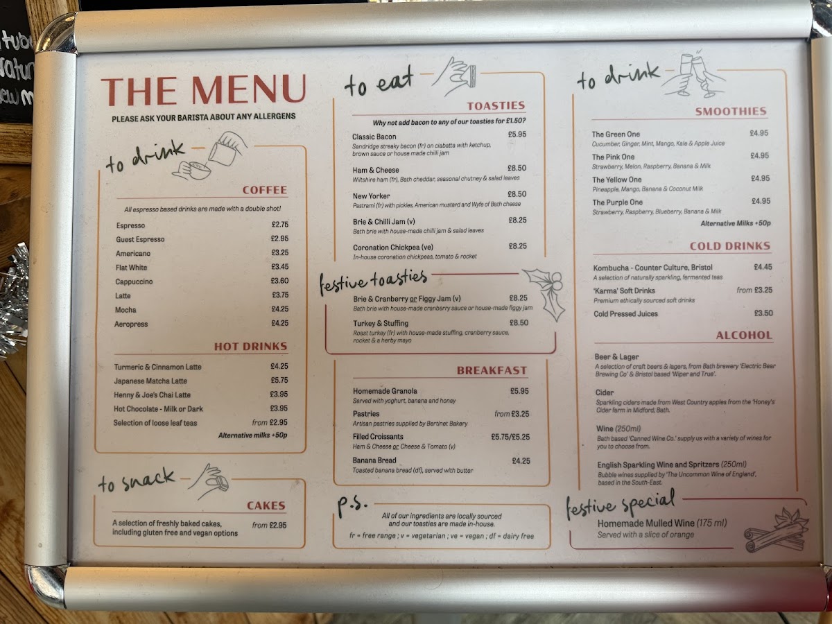 For those who enjoy a heartier breakfast, the Bacon Roll is a must-try, while the Sourdough Toasties offer a variety of choices like HAM & CHEESE, GOAT'S CHEESE & PICKLE (V), and BRIE & CHILLI JAM (V). For something with a local twist, the HAM & BATH BRIE or the vegetarian CORONATION CHICKPEA (VE) are great options.